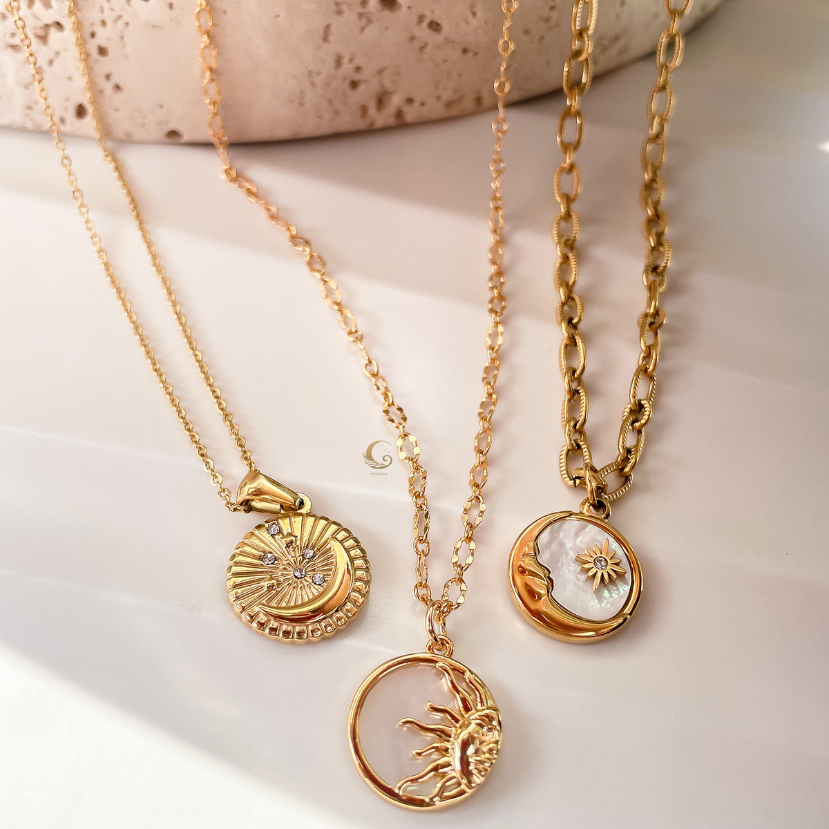 – Elegant crescent moon pendant with celestial detailing